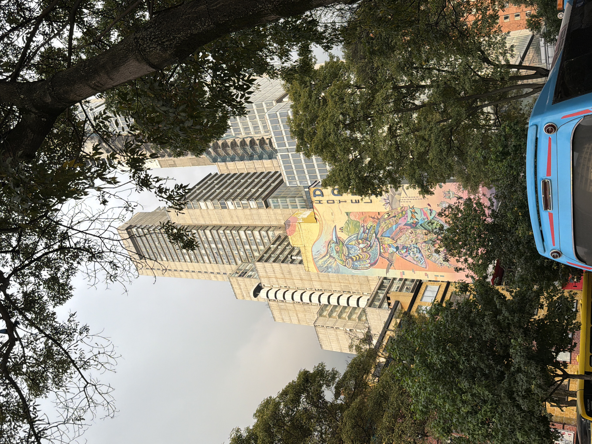 This image presents an urban landscape in Bogotá, Colombia, specifically centered near Carrera 7 #24-89. The prominent structure in the background is the Torre Colpatria, a tall, multi-tiered skyscraper of beige concrete and glass, featuring numerous windows and a distinct vertical, ribbed white cylindrical appendage on its side. To the right of Torre Colpatria, another modern high-rise with a reflective glass facade and an exposed spiral staircase is partially visible. In the mid-ground, a multi-story yellow building displays a large, vibrant mural on its facade. The mural depicts a stylized, colorful bird-like creature rendered in blue, green, orange, and pink hues. The word "HOTEL" is partially discernible above this mural. Trees with dense green foliage heavily frame the scene, obscuring parts of the buildings and the sky, particularly along the top and sides, and across the foreground. In the lower right, the rounded rear section of a light blue bus or shuttle is visible, featuring a red horizontal stripe and a taillight. Below it and to the left, the upper portion of a yellow bus, with the word "BUSSCAR" faintly legible on its side, is partially visible. The sky is uniformly overcast and light grey. No individuals are depicted.
