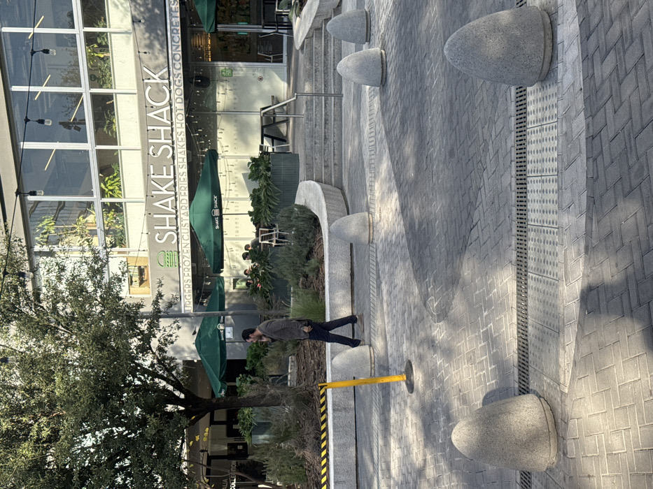 A person is walking past a Shake Shack restaurant. The restaurant has large glass windows and green umbrellas outside. There are trees and plants around the entrance. The sidewalk is paved with grey bricks and has a drainage system. Several decorative, egg-shaped concrete structures line the walkway. A yellow and black striped barricade is also present.