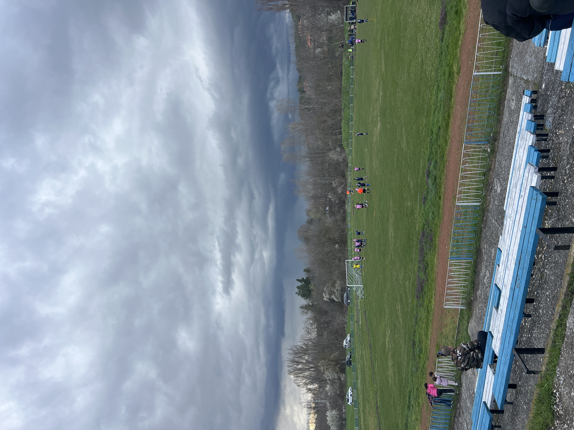 This image depicts an outdoor football (soccer) stadium in Smyadovo, Bulgaria, under a heavily overcast sky with prominent dark, grey clouds suggesting impending rain. The perspective is from elevated concrete spectator stands, which feature rows of blue and white wooden benches in the foreground. A metal fence, painted white and blue, separates the stands from a reddish-brown track that encircles a green grass football pitch. Approximately 15-20 individuals are visible on the pitch, engaged in a football match or training. Players are dressed in distinct kits: one group wears pink/light red tops with dark shorts, another wears blue tops with dark shorts, and two players wear orange or yellow/orange tops, one functioning as a goalkeeper near the left goal. Two white football goals are positioned on the field. Beyond the pitch, a line of deciduous trees, many still bare, forms the background; some trees exhibit white blossoms. Several civilian vehicles, including white, black, and grey models, are parked behind the trees on the left side of the field. Distant residential structures are faintly visible through the trees on a hillside to the right. In the foreground, a male individual wearing a camouflage-patterned jacket is seated on one of the blue and white benches, facing the pitch. To the left, a group of approximately four individuals, including adults and children, stand near the fence. A partial view of another person in a dark jacket is visible in the bottom right corner of the frame.