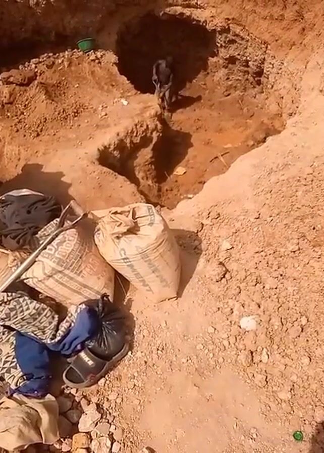 A person is digging in a pit in a sandy, earthy terrain. The pit is several feet deep, and the person is using a tool to break the soil. Several bags, which are likely cement bags, are on the ground near the pit, along with a shovel, clothes, and a pair of sandals. The area seems desolate.