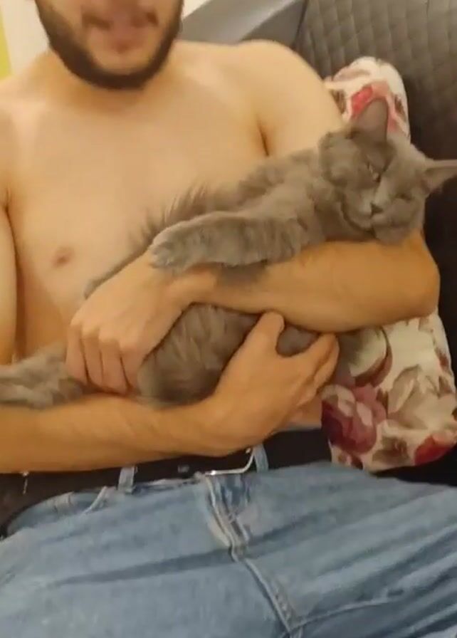 A shirtless man with a beard is sitting on a black leather couch, wearing jeans and one white sock. He is holding a medium-haired gray cat in his arms. The cat appears relaxed and is resting its head on the man's arm. The background includes a yellow wall and a patterned cushion on the couch. The camera zooms in on the man's arm and the cat.