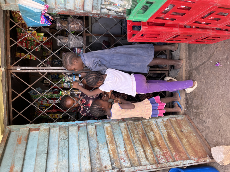 This image depicts an open-front shop in Jos, Nigeria, showing an interaction between an adult female shopkeeper and four children