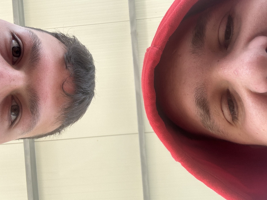 An extreme low-angle, upward-facing close-up photograph depicts the faces of two individuals against a plain, light-colored background. The upper half of the image features the inverted head of a person with dark hair, dark eyes, and pronounced eyebrows, looking downwards. Below this, partially separated by a light grey horizontal line on the background, the upper face of a second individual is visible. This person wears a red hooded garment framing their face, displaying dark eyes also looking downwards, prominent eyebrows, and the bridge and tip of their nose. The background appears to be an interior wall or ceiling, exhibiting subtle vertical and horizontal seams consistent with paneling. The location is an indoor setting in the city of Unknown, Unknown.