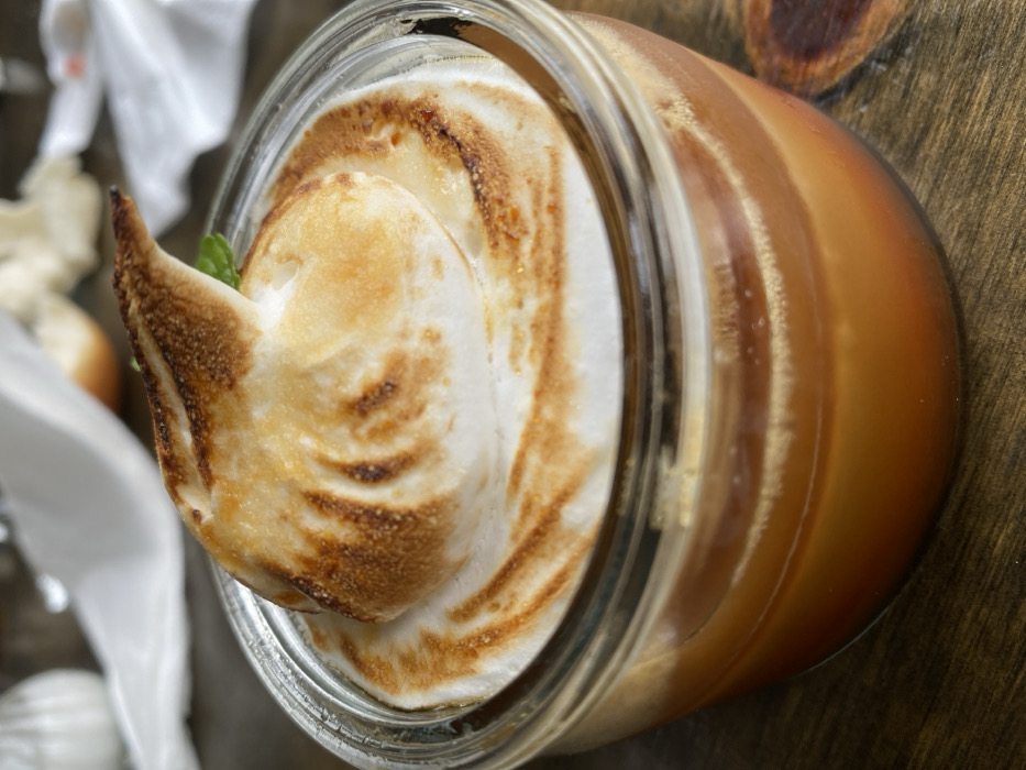 - "A jar of dessert sits on a wooden surface, featuring a toasted meringue topping with a swirl pattern and a single green leaf as garnish" by FM-uji6n1, licensed under CC BY 4.0