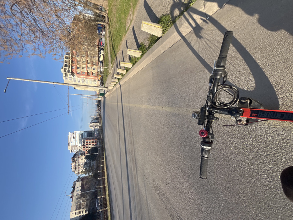 - "The image presents a first-person view from a bicycle, evidenced by black handlebars, a red bell, and a mounted headlight in the immediate foreground" by FM-ddoUt1, licensed under CC BY 4.0