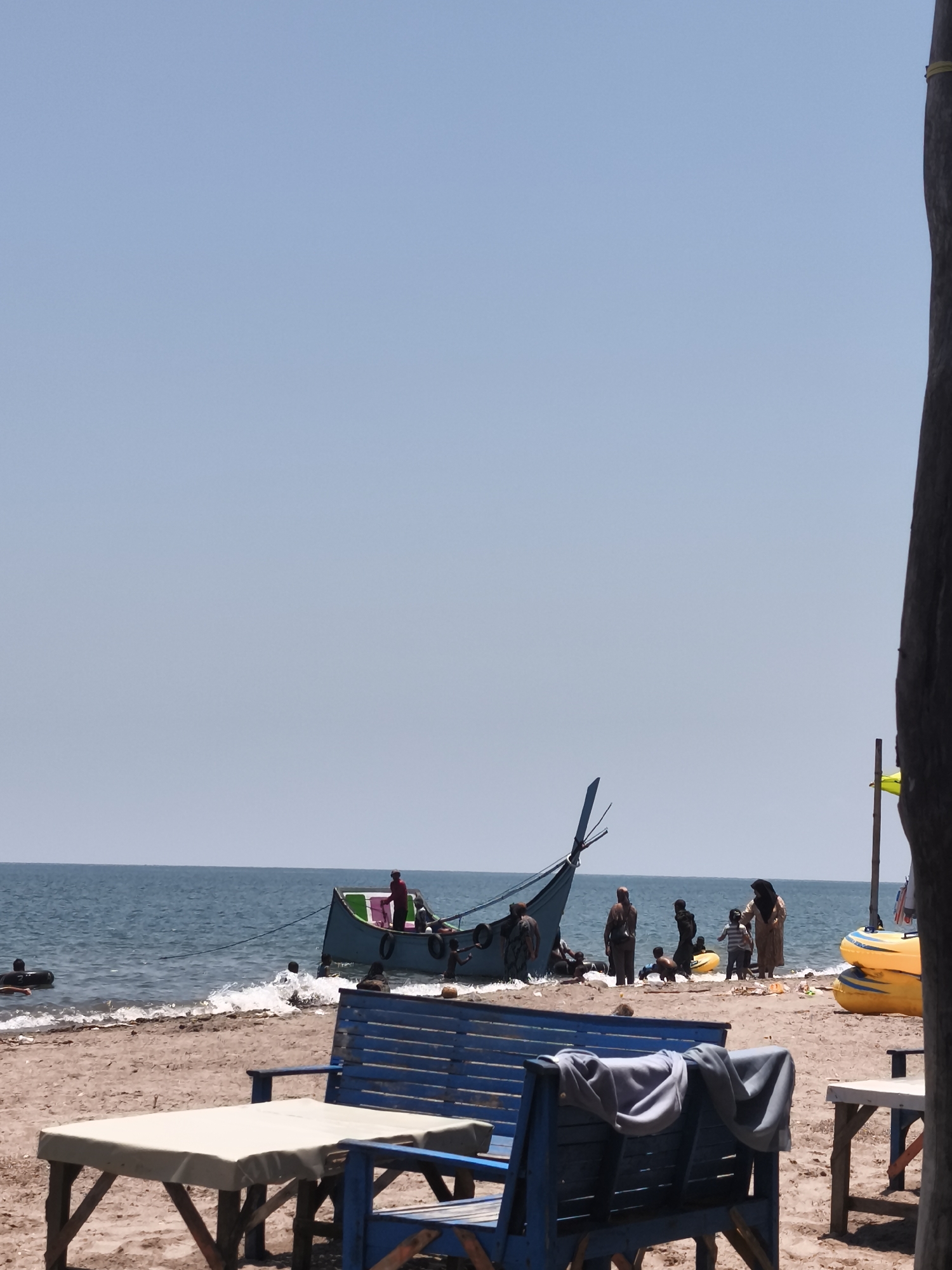 The image depicts a daytime beach scene in Lhokseumawe, Indonesia. A clear, light blue sky occupies the upper two-thirds of the frame, meeting a calm, blue-green sea at the horizon. The foreground and midground consist of a light brown sandy beach with small waves breaking at the waterline. In the midground, a light blue wooden boat, characterized by a high, pointed bow and stern, is partially beached in the shallow water, angled towards the left. Several individuals, including adults and children, are congregated in and around the boat; one person in a red top is visible inside the vessel. To the left of the boat, a person is in the water with a black inner tube. On the right side of the midground beach, a group of approximately five to seven individuals, comprising adults (some wearing headscarves) and children, are standing or interacting near the water's edge. A small yellow inflatable toy is present near a child in this group. Further right, two yellow inflatable watercraft are stacked on the sand. A wooden pole with a yellow flag or ribbon is planted in the sand near these inflatables. The immediate foreground features three blue wooden benches and two wooden tables. The central table is covered with a light-colored cloth. A grey towel is draped over the back of the left-most blue bench. A dark, vertical wooden post partially frames the extreme right edge of the image.
