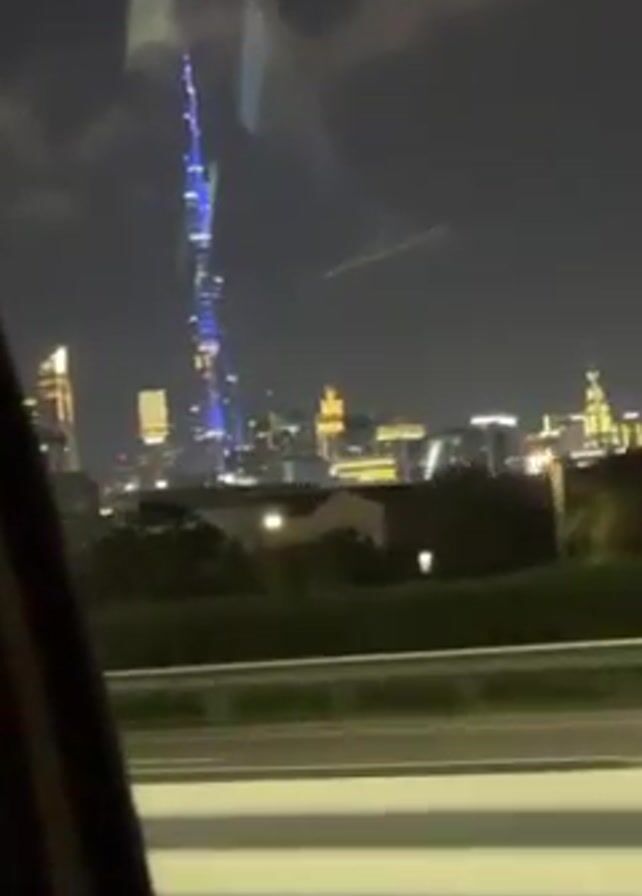 nighttime view of the Dubai skyline from inside a moving vehicle