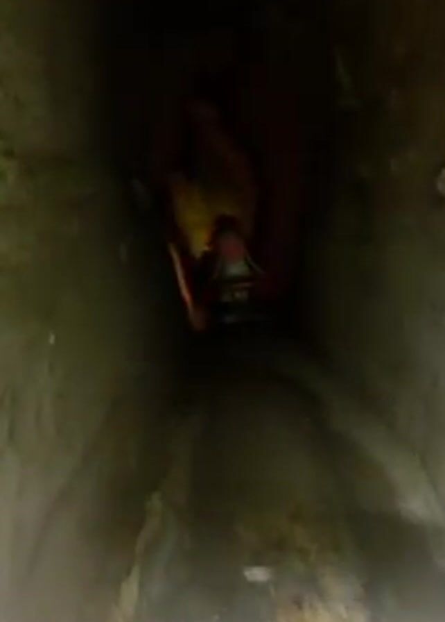 The camera view shows a dark, tunnel-like structure with uneven, textured walls, likely stone or concrete