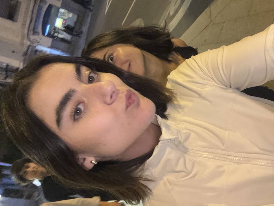 The image depicts three individuals on a city street at night in Madrid, Spain. In the immediate foreground, a young female with short dark hair, prominent eyebrows, and a light complexion faces the camera, wearing a light-colored, high-collared, full-zip athletic jacket and a small gold-colored hoop earring in her left ear. She exhibits a puckered lip expression. To her right and slightly behind, a second young female with dark hair is partially visible, looking upwards and to the right with wide eyes and a slightly open mouth. Behind the foreground subject's left shoulder, a male with dark, disheveled hair and a dark long-sleeved shirt is partially visible, looking towards the camera with a neutral expression. The background features a paved urban street with a white pedestrian crossing. Multi-story buildings with lighted windows and several illuminated storefronts, one displaying a distinct blue sign, line the street. Additional indistinct pedestrian figures are visible further down the street, suggesting an active urban environment. The scene is illuminated by artificial light sources.