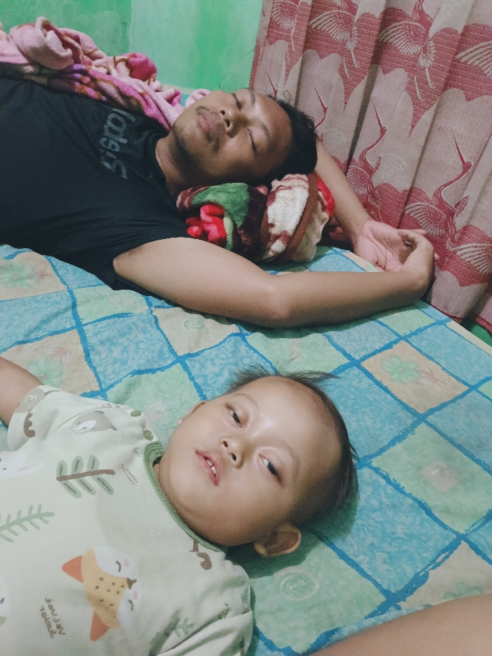 An adult male and a young child are positioned lying on their backs on a bed in an indoor residential setting in Kecamatan Pati, Indonesia