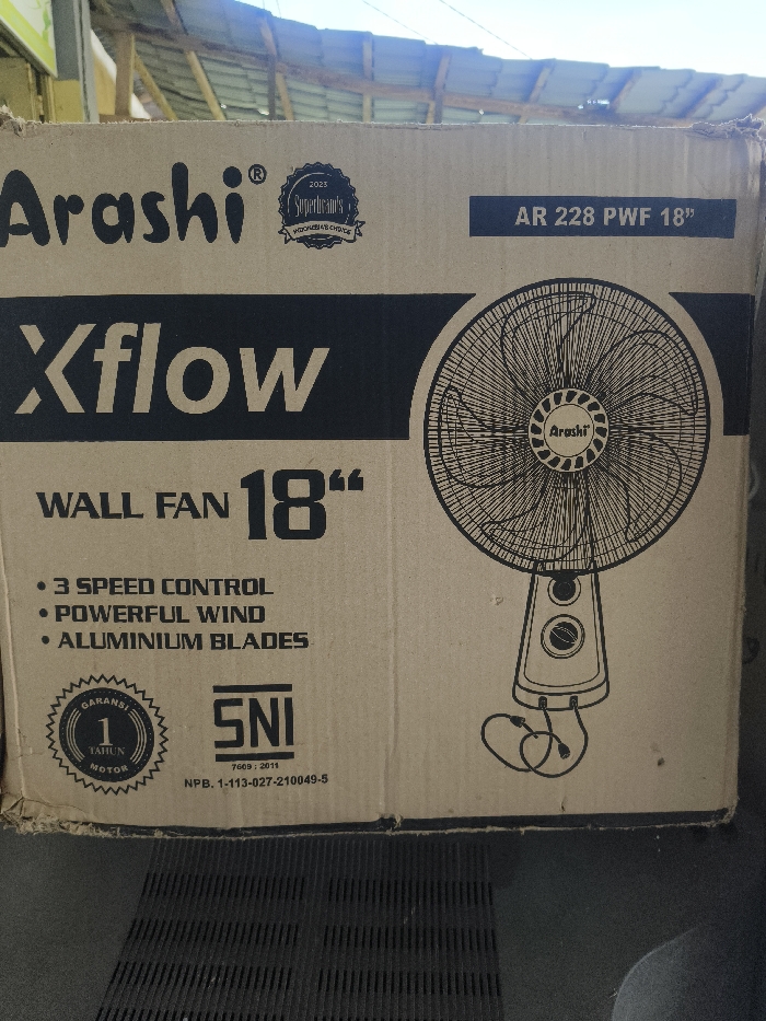cardboard box for an Arashi Xflow 18-inch wall fan. Text indicates features: 3-speed control, powerful wind, and aluminum blades. A diagram of the fan is printed on the box. Seals guarantee the motor for one year and indicates it meets SNI standards. "AR 228 PWF 18" is written on the box. A "Superbrands Indonesia's Choice" seal is also visible.