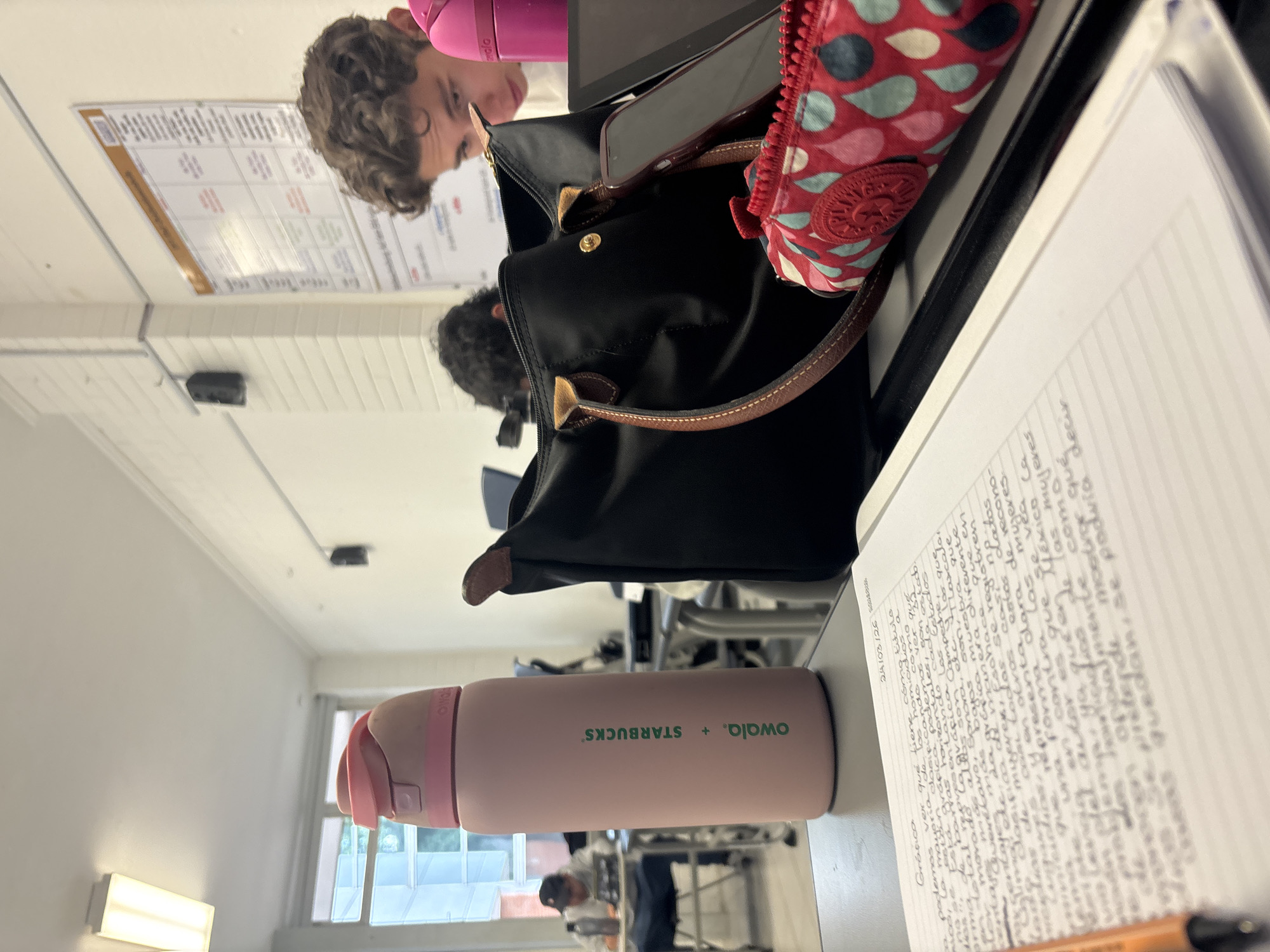 The image depicts an indoor scene, likely a classroom or study area, within the city of Puebla, Mexico. The foreground features an open spiral-bound notebook on a desk, displaying handwritten Spanish text, with an orange pen or pencil tip at the bottom left. A date, "24/03/26," is visible at the top right of the page. To the left of the notebook stands a pale pink Owala + Starbucks branded water bottle. To the right, a black handbag with brown leather straps and gold hardware is partially open, positioned next to a dark-colored smartphone in a maroon case, resting on a dark surface. A red and white patterned Kipling pouch is visible in front of the handbag. In the midground, a young male with curly brown hair is visible from the forehead to the eyes on the right, looking downwards. A magenta water bottle is partially visible next to him. Another individual with dark hair is seated behind the black handbag, facing away. In the background on the far left, a third individual wearing a dark cap is seated at a desk, looking down. The room features white painted brick walls, white fluorescent light fixtures on the ceiling, and black speakers mounted on the wall. A large window on the left reveals greenery outside. Grey desks and chairs are arranged throughout the space. A large white poster or schedule board with text and grids is affixed to the wall on the right.