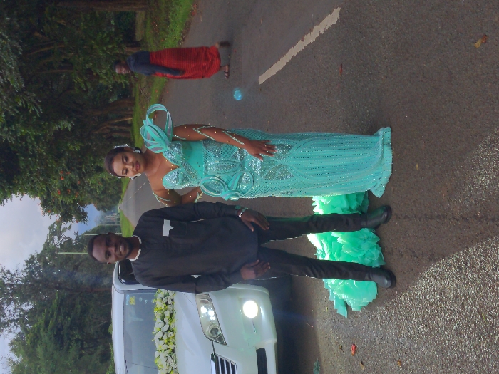 A man and a woman are standing on a paved road. The woman is wearing a long turquoise dress and the man is wearing black pants and a black shirt. The man is standing with his feet slightly apart, while the woman is standing with her feet together. The woman is holding her right hand out to her side. The man is looking straight ahead at the camera. The woman is looking straight ahead at the camera. There is a white car parked on the left side of the image. There are trees and bushes on both sides of the road. The road is paved and has a white stripe down the center. There is a white car parked on the left side of the image. In the background, a woman is walking toward the camera on the opposite side of the road. The location is a road in New Hope, Tanzania, based on coordinates (latitude: -3.275, longitude: 37.317). The sky is overcast. The image appears to have been taken in the early morning or late afternoon.