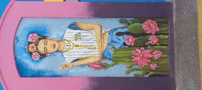 A horizontal painting depicts Frida Kahlo reclining. She wears a striped shirt with the letter "M," jean shorts, and a gold necklace. Her hair is adorned with flowers, and she's surrounded by blossoming cacti. The artwork is framed within a pink archway-like structure with blue background. The edges of the painting are defined by grey and yellow lines, suggesting it may be a section of a larger mural.