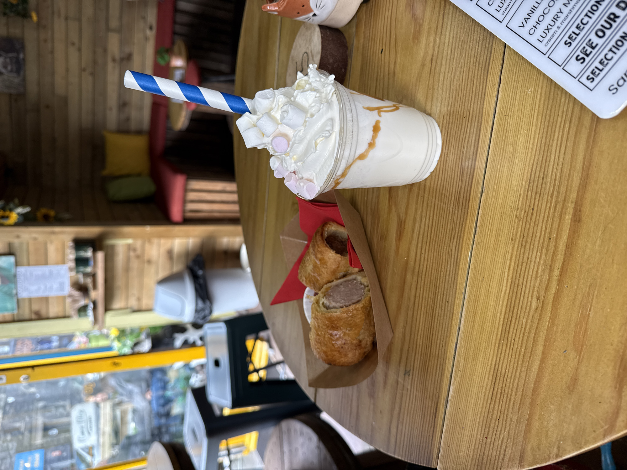 The image displays an indoor scene within a commercial establishment, identified as a cafe or eatery, located in Windermere, United Kingdom. In the foreground, a light-colored wooden table dominates the view. On the table, centrally positioned, a clear plastic cup contains a milkshake with caramel drizzles visible on the interior. The drink is heavily topped with whipped cream and garnished with multiple white and pink mini marshmallows. A blue and white striped paper straw is inserted into the beverage. To the left of the milkshake, a brown cardboard tray holds two pastry items identified as sausage rolls. One roll is whole, while the other is cut in half, exposing the meat filling. A small white condiment container and red paper napkins are present within the tray. A partially visible white menu card with black text, displaying items such as "VANILLA," "CHOCO," and "LUXURY," is situated in the bottom right corner. To the right, a partial view of an orange and white decorative object, possibly a ceramic fox head, is visible. Behind the milkshake, a dark brown, round wooden coaster or decorative slice is present. The background reveals the cafe's interior, characterized by walls clad in light brown wooden planks. To the left, a large window with a yellow frame provides an obscured view of an urban streetscape. A blurred human figure, appearing to be female with light hair, dressed in a grey top and blue bottoms, is visible through the window, potentially seated at an outdoor table. Inside, to the right of the window, a white lidded trash can with a black liner is positioned. Above the trash can, a wooden shelf holds various small containers and possibly decorative sunflowers. Further to the right and deeper into the establishment, a seating area features red upholstered benches with green and yellow cushions, accompanied by a small round wooden table. The ambient lighting indicates an indoor setting with natural light filtering through the window. No direct interactions between individuals are depicted, and the scene is static.