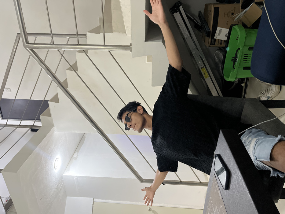 An indoor scene in Komchén, Mexico, depicts a single male subject seated in a dark gray upholstered chair, facing slightly right of the camera. The male has dark hair, is wearing sunglasses, a black textured short-sleeved t-shirt, and light blue ripped denim shorts. His arms are outstretched horizontally to his sides, palms open, and his head is tilted back, looking upwards. A black smartphone with a white cable is on a dark table in the immediate foreground, to the left. In the background, a modern white staircase with stainless steel railings ascends to an upper level, where a dark door is visible. Beneath the staircase, a cluttered area contains a folded silver step ladder, cardboard boxes (one marked "SMD1"), a bright green plastic shopping basket, and a dark blue rolled item. A white shoe with a dark swoosh is visible near the basket. A recessed circular ceiling light is visible above the male subject, to the left of the stairs.