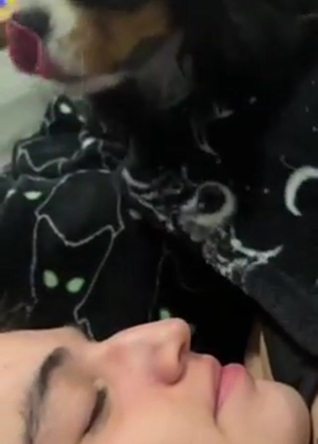 A woman lies on her back, eyes open, looking up. A black, brown, and white Cavalier King Charles Spaniel dog stands on top of her chest. The dog looks at the woman, then turns to look off to the side. The woman is covered with a black fuzzy blanket featuring white crescent moons and cat images. In the background, a tiled table is seen.