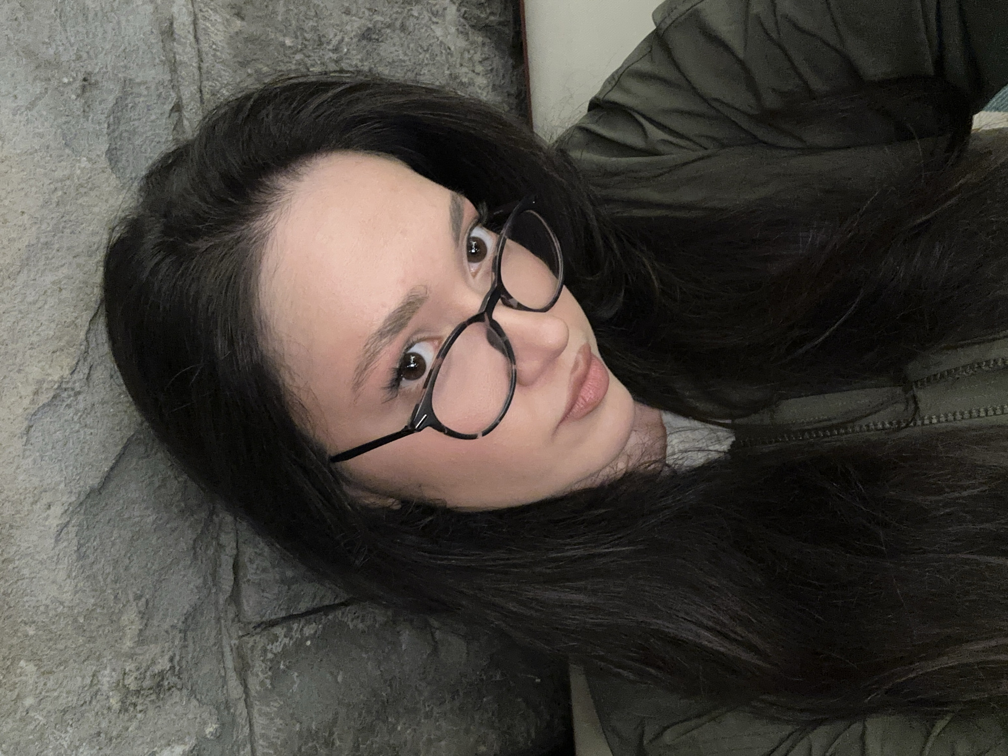 A close-up, slightly high-angle portrait features a female individual with long, dark hair and fair complexion. She is wearing round eyeglasses with dark, patterned frames. Her brown eyes are directed intently towards the camera. She has defined eyebrows and subtle makeup, including eyeshadow and possibly a lip tint. The individual is dressed in a dark olive-green zippered jacket, with a lighter-colored top visible underneath at the neckline. The background consists of a textured grey stone wall, characterized by uneven surfaces and visible mortar joints, occupying the upper left and central-left portions of the frame. A lighter, smooth surface, possibly upholstery or another wall, is partially visible to the right. The scene is located in Yerevan, Armenia.