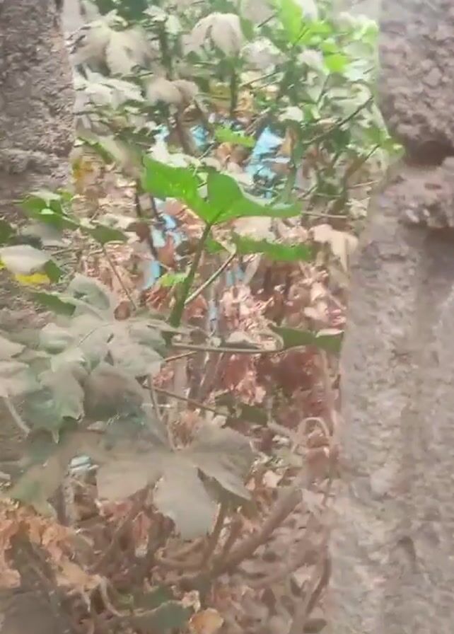 partially destroyed or dilapidated brick structure with overgrown vegetation inside. The camera pans around the scene, revealing rubble, loose rocks, and a couple of large white bags. There's also a tire and a white plastic container visible amidst the debris. The background shows glimpses of other structures through openings in the brick walls. The overall environment appears run-down and neglected.