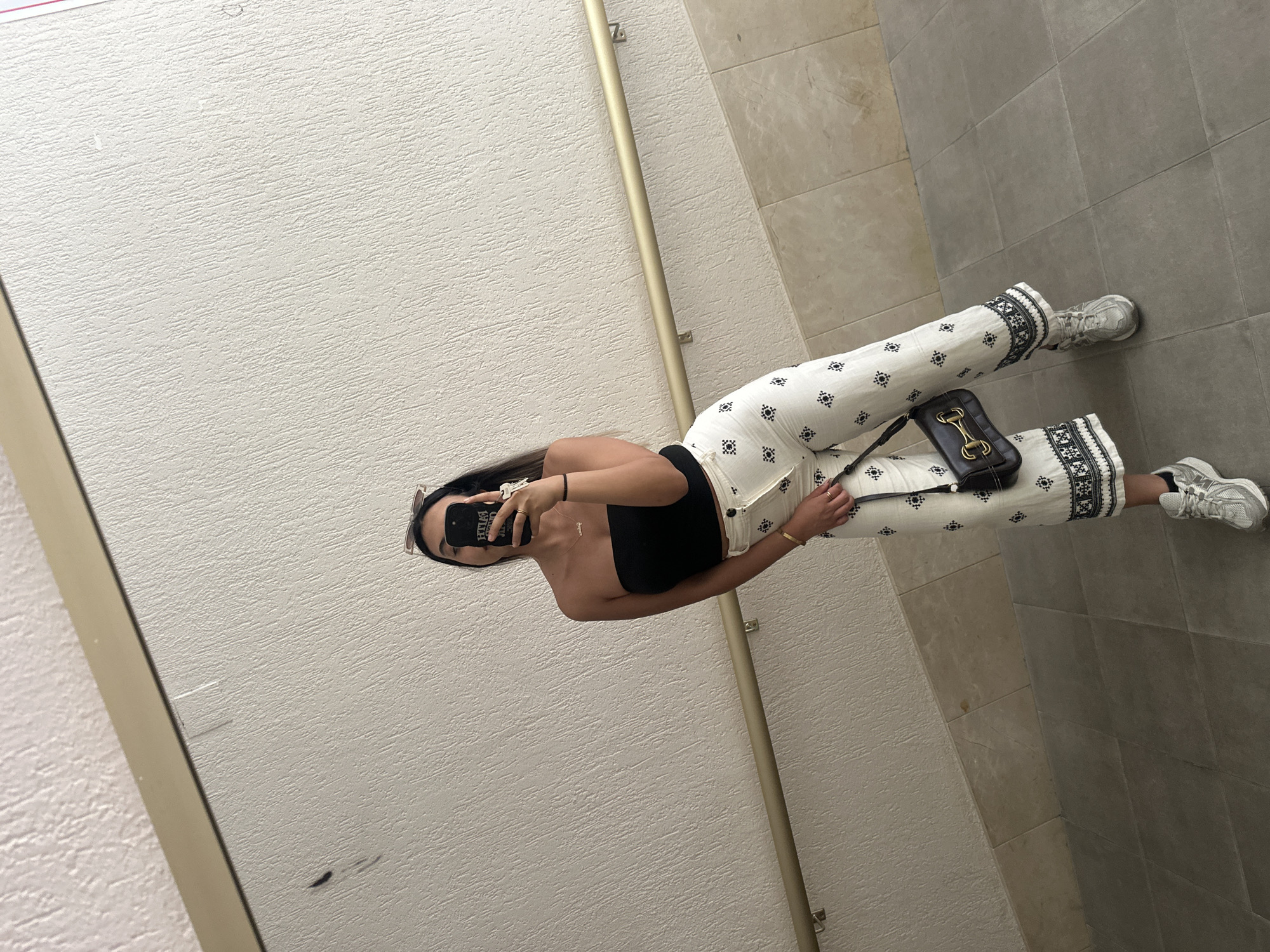 The scene is an interior mirror selfie taken by an individual in Alicante, Spain. The person, whose face is obscured by a black smartphone displaying "FAITH" in reverse, is dressed in a black strapless top, white wide-leg trousers adorned with black geometric patterns, and grey athletic sneakers with black socks. Accessories include sunglasses resting on the head, a gold-colored necklace, a gold bracelet, multiple rings, and a black crossbody bag featuring a gold horse-bit clasp. The background consists of a textured, light beige wall with a gold-colored metal handrail fixed diagonally, indicating an upward slope, mounted on two visible brackets. The floor is tiled, featuring a light beige perimeter strip adjacent to the wall, and grey square tiles covering the main surface.