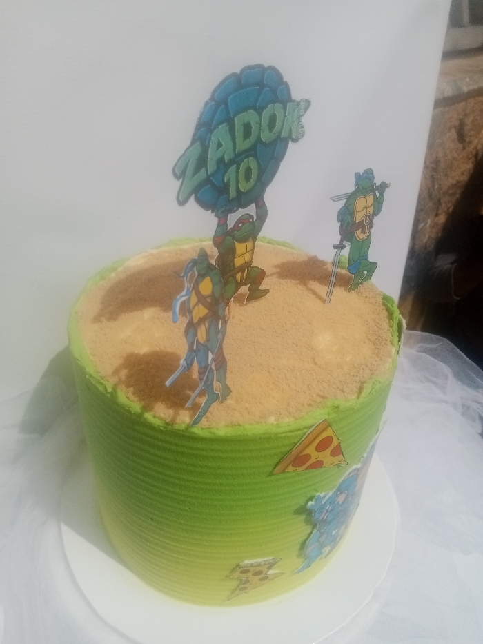 This scene depicts a multi-tiered, round birthday cake on a white cake board, set against a predominantly white background in what is described as the city of Jos, Nigeria. The cake's cylindrical sides are uniformly light green with a subtle horizontal ribbed texture, suggesting a buttercream or similar icing application. The top surface of the cake is covered with a granular, light brown or tan crumb topping. Three Teenage Mutant Ninja Turtles (TMNT) character cutouts are positioned upright on the cake's crumb-covered top. One figure, identifiable as Raphael (red bandana), is centrally placed, appearing to hold a large blue, turtle shell-shaped topper that reads "ZADOR 10" in light green block letters. To the right, another TMNT character, Leonardo (blue bandana), stands with two katanas. A third TMNT character is partially visible on the left, also standing upright. These appear to be paper or cardstock cutouts on picks. The sides of the cake feature additional flat, printed cutouts, including several triangular pizza slices with pepperoni, and other smaller, less distinct TMNT-themed imagery. The cake board rests on a smooth, white surface, with a gathered sheer white fabric, possibly tulle or organza, visible along the right edge of the frame. The background is largely out of focus and white, with a darker, indistinct shape present in the upper right. Lighting is bright and even, casting soft shadows beneath the cake toppers.