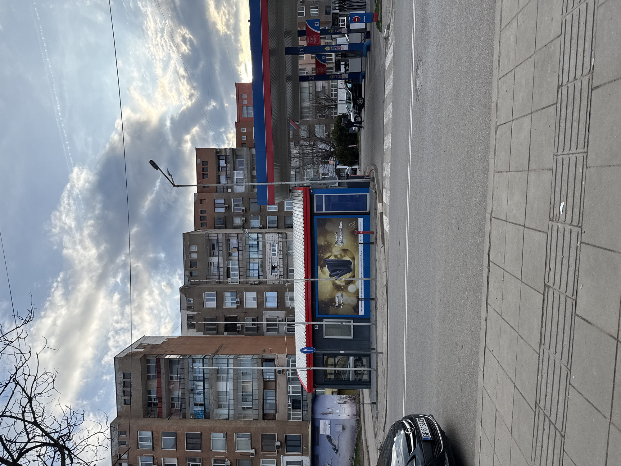 An urban street scene in Vratsa, Bulgaria, is depicted under an overcast sky with patches of blue and visible high-altitude clouds. The foreground features a concrete sidewalk with grey paving slabs, including tactile paving strips at a corner. The asphalt road beyond the sidewalk has two lanes marked with white lines and a designated pedestrian crosswalk. The front end of a dark-colored Opel vehicle (Bulgarian license plate BP 8156 CP) is partially visible on the left, parked or stopped near the curb. To the right of the sidewalk, a small, modern-style building or kiosk with a blue and grey facade and a red-striped roof stands. Its front displays a large advertisement for IQOS, featuring a device and Bulgarian text that translates to "Your moment." and "Your convenience." A red fire hydrant is visible on the sidewalk near this building. Adjacent to its left, another smaller, older building features a mural depicting several storks in flight against a blue background. Behind the kiosk, a gas station operates under a blue and red canopy. Multiple fuel pumps are visible, marked with fuel types such as "ДИЗЕЛ" (Diesel) and "А 95" (A 95). A sign indicating "ИЗХОД" (Exit) is present. Inside the gas station area, at least two vehicles are present, one dark sedan with its front door ajar. A single individual stands between these two vehicles, facing towards the fuel pumps. In the background, a row of multi-story residential buildings, primarily constructed with concrete or stucco, rises. These buildings exhibit varying states of repair, some with exposed brick or concrete, multiple windows, balconies (some with glass enclosures or metal railings), and visible air conditioning units. Overhead power lines and a street lamp are also present. Bare tree branches are visible in the upper left foreground.
