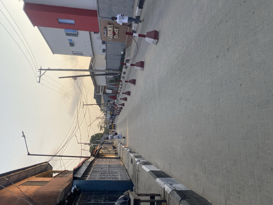 A straight, wide street lined with buildings and utility poles runs into the distance. The road has a gray, brick-like surface and is bordered by a black and white curb on the right. On the left side of the street, a series of red and white traffic cones stand alongside a building with a sign that reads "Harmony Estate." Further down the street, several people are visible in the distance. The sky is overcast, and the overall lighting is muted.