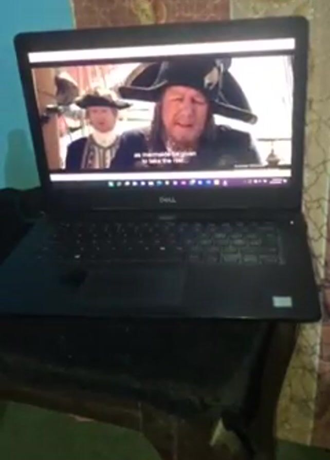 A close-up shot shows a Dell laptop sitting on a small, dark-colored table. The screen displays a scene from a movie or show featuring two men in period attire, one of whom is speaking. The video is captioned. A partially visible blue water bottle is positioned to the left of the laptop. The background includes a light brown and gold patterned wall covering on the right, and a blue wall on the left. The table has a black velvet-like cloth on it.