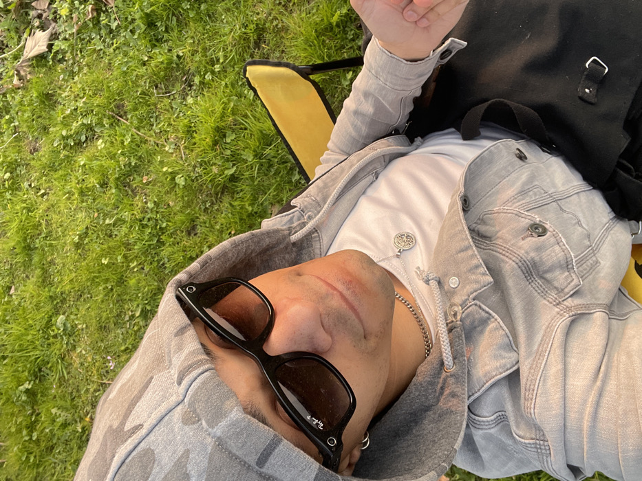 A single male individual is depicted in a close-up, high-angle shot, seated outdoors in a grassy area. The individual, appearing to be of Hispanic or Middle Eastern descent, is wearing dark Ray-Ban P sunglasses, a grey camouflage-patterned hooded garment with the hood up, a light grey denim jacket, and a white t-shirt. A silver-colored chain necklace with a circular "Tree of Life" pendant hangs from his neck, and a silver hoop earring is present in his left ear. He exhibits a slight smile or smirk and a visible scar or mark on his left cheek/jawline. He is seated on a yellow and black portable camping or lawn chair, with a black bag or strap visible on his lap. The environment consists of a vibrant green grassy expanse with scattered brown leaves, indicative of a park or open field. Natural sunlight illuminates the scene from the right, creating soft highlights. The specific location within Plaisir, France, is not visually discernible from the image provided.