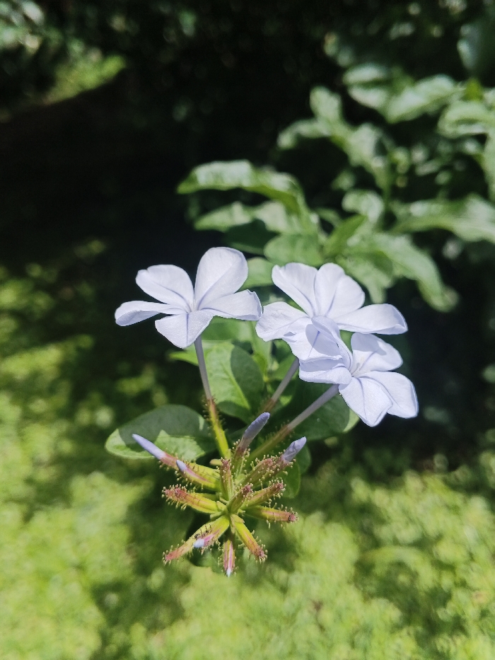Three pale blue plumbago flowers bloom atop a green plant with spiky buds. Lush green foliage provides a backdrop, blurring into a deeper green shade in the background. The area around the plant is softly lit, creating a gentle contrast between the foreground and the shadowed areas. The overall effect is a serene and natural floral study.