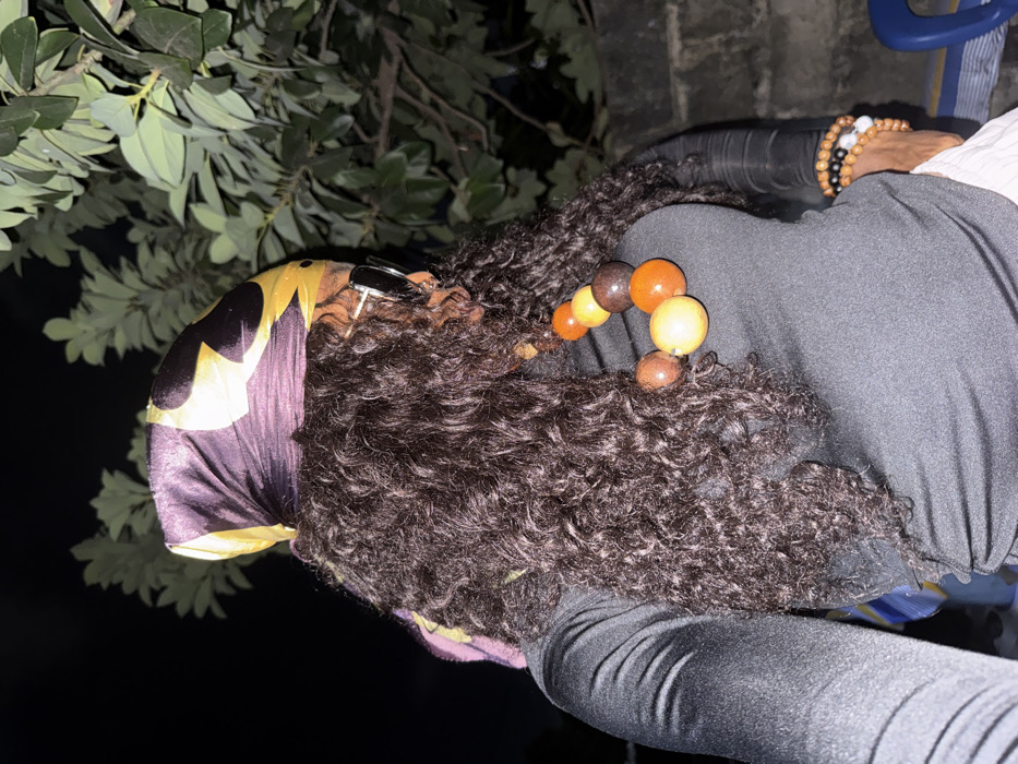 A person with curly brown hair, adorned with wooden beads, wears a colorful headscarf