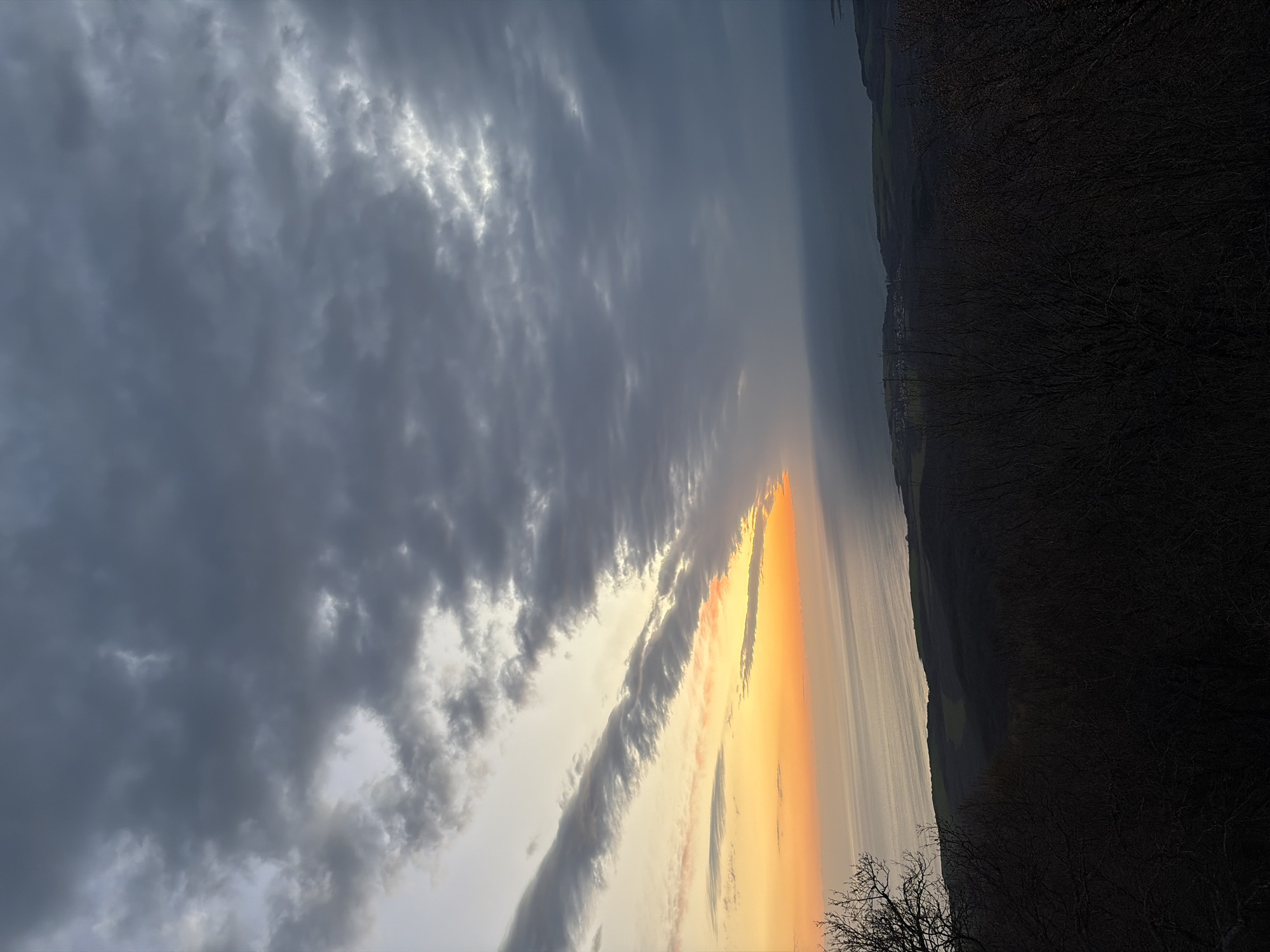 landscape at sunset, likely near Brodilovo, Bulgaria, as suggested by the tags. The sky is filled with dark, textured clouds on the left side, transitioning into lighter clouds and a vibrant orange and yellow sunset towards the center. On the right, a coastline is visible with dark, silhouetted trees in the foreground. The sun's reflection creates a bright line on the water's surface. There are no people visible in the image.