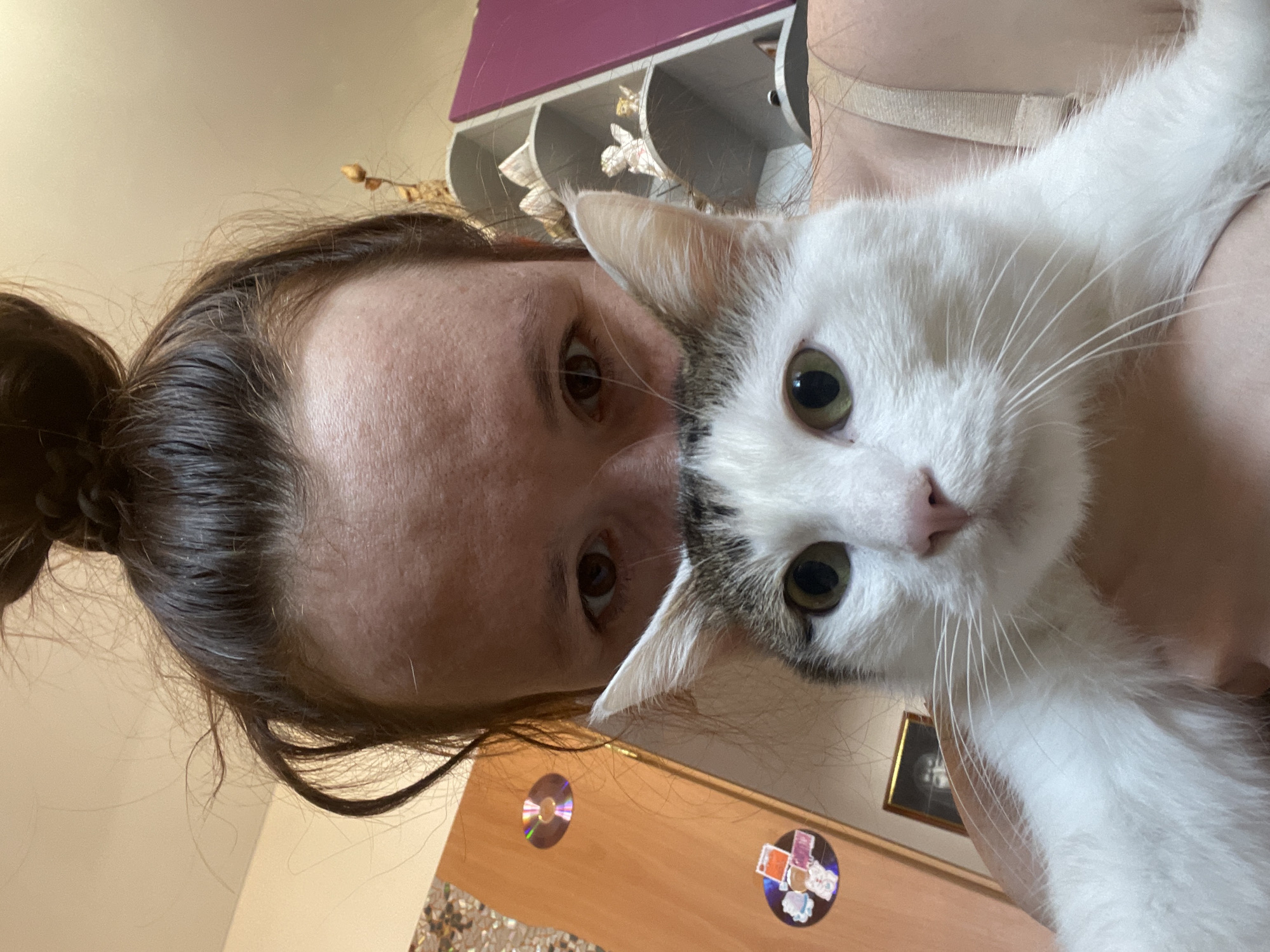 The scene is set indoors in a room located in Podstepki, Russia. The image features two primary subjects: a person and a cat, captured in a close-up, upward-angled perspective. A person is partially visible, primarily the upper portion of their face, positioned behind the cat. The person has brown eyes and dark hair pulled back into a messy bun at the top of the head. The upper forehead, eyes, and the bridge of the nose are discernible. A light-colored strap, consistent with a bra or tank top, is visible on the person's right shoulder area. In the foreground, a white cat with distinct gray-brown markings on its head and ears is present. The cat has prominent green-gold eyes, a pink nose, and white whiskers emanating from its muzzle. It is oriented slightly to the viewer's left, appearing to be held or resting against the person's body. The background reveals typical indoor elements. To the left, a light brown wooden surface, possibly a cabinet or door, displays two reflective compact discs affixed to it; one exhibits a rainbow spectrum, and the other is adorned with stickers. Below the lower disc, a framed picture depicting a dark-haired figure is partially visible. To the right, a white shelving unit with multiple compartments is observed, featuring a prominent magenta side panel. Decorative objects on the shelves include a white angel figurine and a smaller golden figurine.