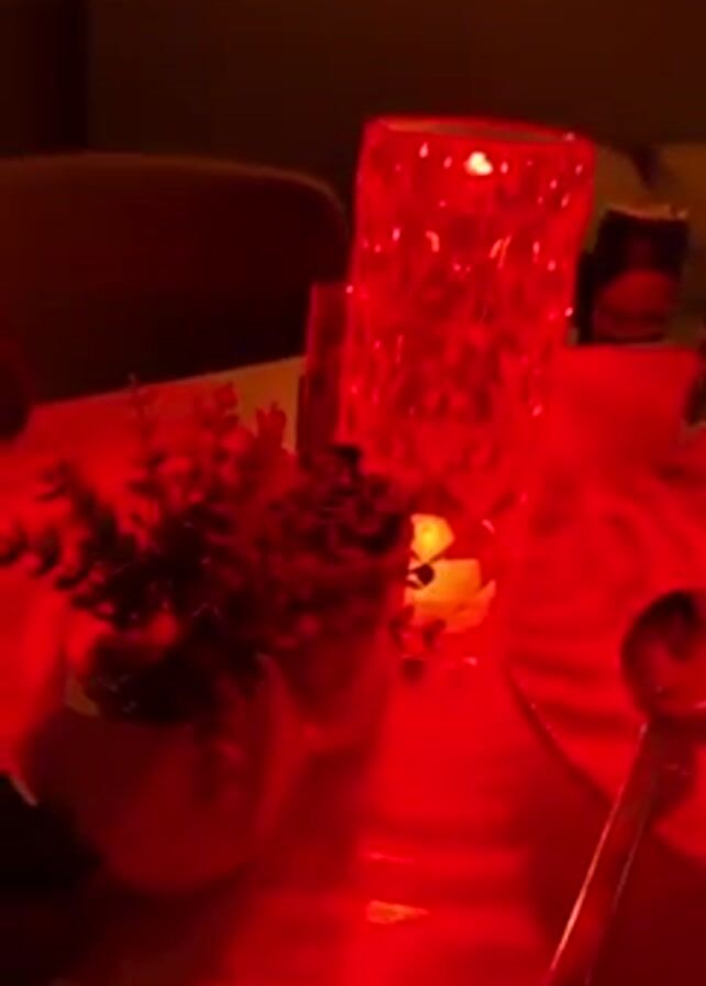 The video presents a close-up shot of a table setting under dynamic colored lighting