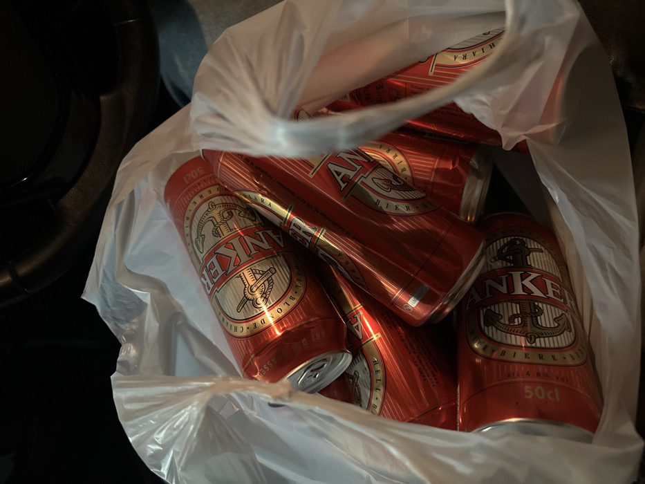 The image displays a white, translucent plastic shopping bag containing multiple red aluminum beverage cans. The cans are branded "ANKER" with a prominent anchor logo, text indicating "HELL BIER" and "BIRRA CHIARA," and a volume marking of "50cl." At least seven such cans are visible, stacked within the crumpled bag. The bag is positioned inside a vehicle, with a black steering wheel rim discernible in the upper background and a portion of what appears to be a person's leg clad in blue denim trousers visible on the right side of the frame. The lighting is dim, indicating an interior or nighttime setting. This scene is located in Wetzikon (ZH), Switzerland.