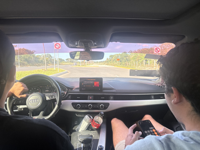 Inside an Audi, the driver is at the wheel, going 48 km/h, and navigating a turn on a sunny day. A passenger is on the phone, using the calculator app. Signs indicating no left turn and no entry are visible. An energy drink and a bottle of water sit in the central console of the car. Music is playing on the dashboard screen.
