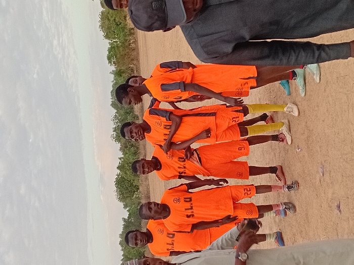 A team of young men in orange jerseys stands in a line on a dirt field. They wear different colored socks and cleats. Trees and a pale sky are in the background. The jerseys have the letters "D.T.S" on them, with numbers on the shorts. A man in a gray jacket and cap is at the top, with another man's arm and watch visible at the bottom of the image.