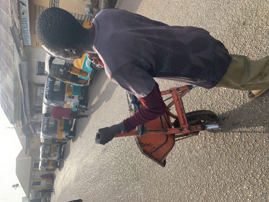 - "A young person pulls a small, orange wheelbarrow along a paved street lined with parked auto-rickshaws" by FM-czBTY2, licensed under CC BY 4.0