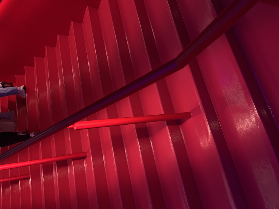 The image displays an indoor staircase, specifically the all-red staircase at the Paradox Museum in Dallas, Texas