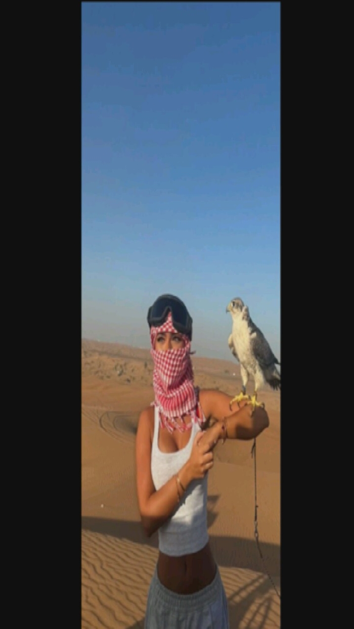 A woman stands in a desert landscape, likely Dubai, dressed in a white tank top and grey sweatpants. Her face is partially covered with a red and white checkered scarf, and goggles rest on her head. A falcon perches on her left arm, tethered with a cord. The background features rolling sand dunes and a clear blue sky.