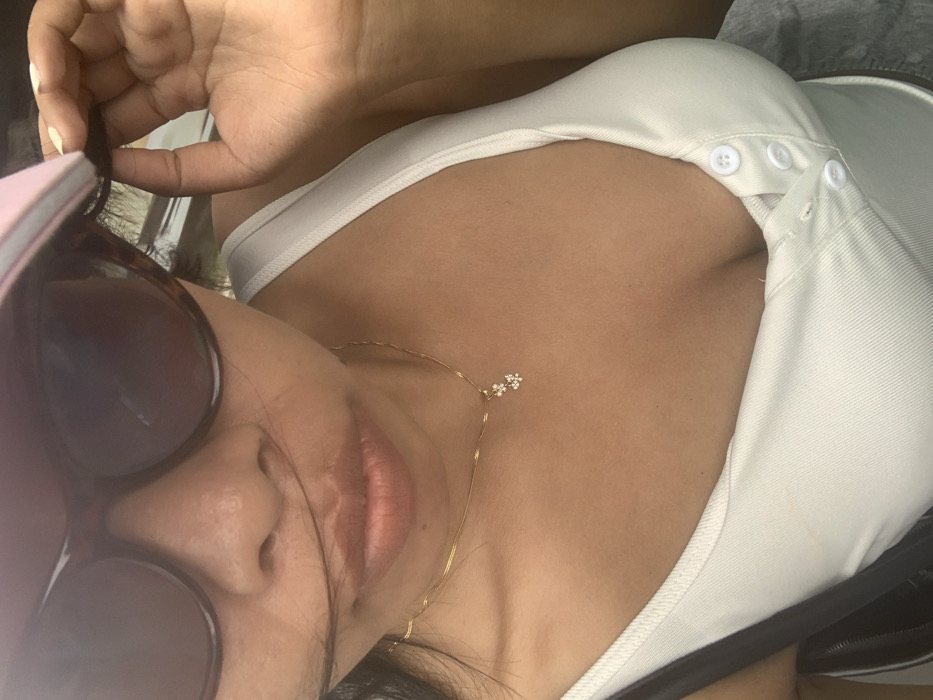 A close-up, high-angle self-portrait features an adult female, partially obscured from the nose upwards. She has an olive complexion and wears dark, tortoise-shell framed sunglasses, a pink-brimmed cap, and a white ribbed tank top with a three-button placket. A thin gold-colored chain necklace, adorned with a small pendant featuring two clusters of white, possibly crystalline elements, rests on her upper chest. Her right hand, exhibiting natural nails, is visible in the upper right portion of the frame, holding a strand of her dark hair near the cap's brim. A black strap, indicative of a bag, is visible over her left shoulder. The background is heavily blurred and indistinct, suggesting an outdoor environment. The scene is located in Kerobokan Kelod, Indonesia.
