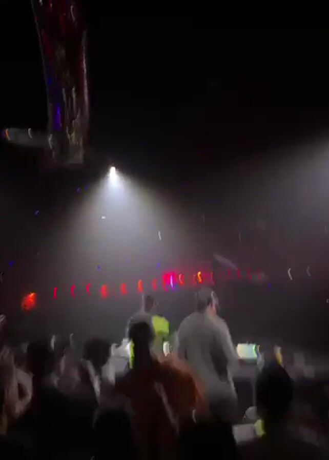 In a dimly lit club, a DJ performs for a crowd