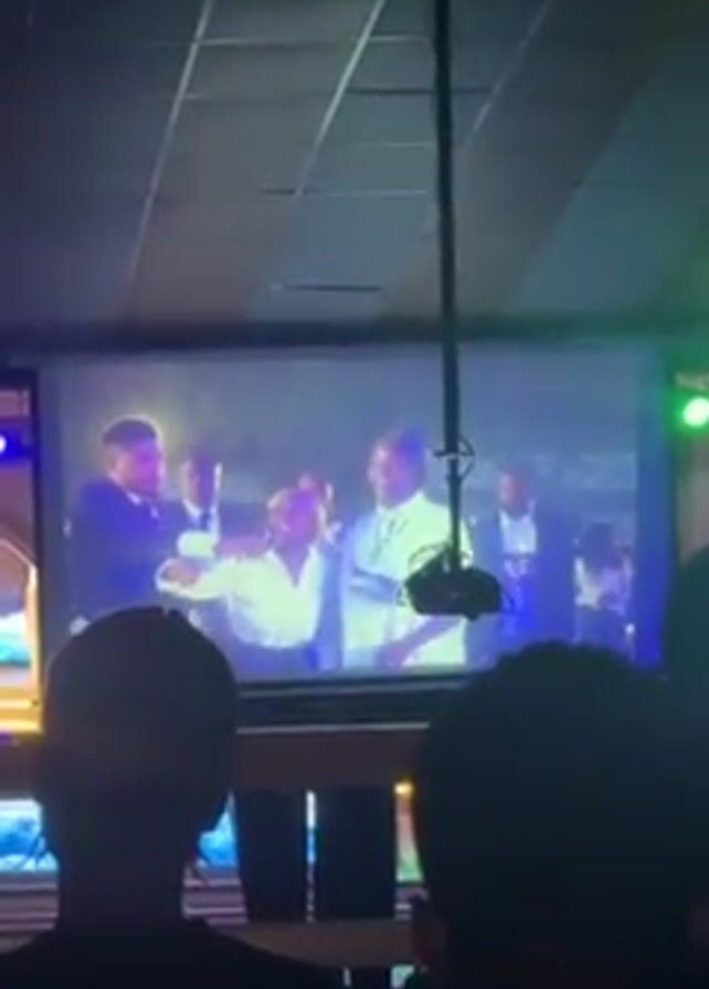A group of people are watching a video projected onto a screen in a dimly lit room. The video appears to show a formal event with people in suits. There are lights visible above the screen and two additional screens on the left. The camera angle is looking up at the screen from behind some of the people watching.