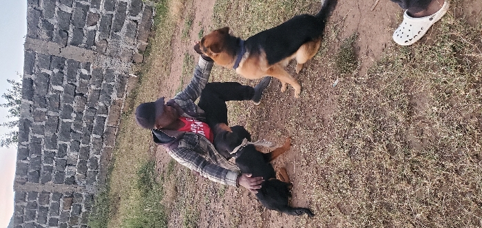 A man in a red shirt and plaid jacket is sitting on the ground, interacting with two dogs. One dog is a black and tan German Shepherd, and the other is a black and brown Rottweiler. The man is holding the Rottweiler, while the German Shepherd is standing next to him. A stone wall is in the background, and the ground is covered with dry grass and dirt. Part of a foot wearing a white sandal is visible in the upper right corner.