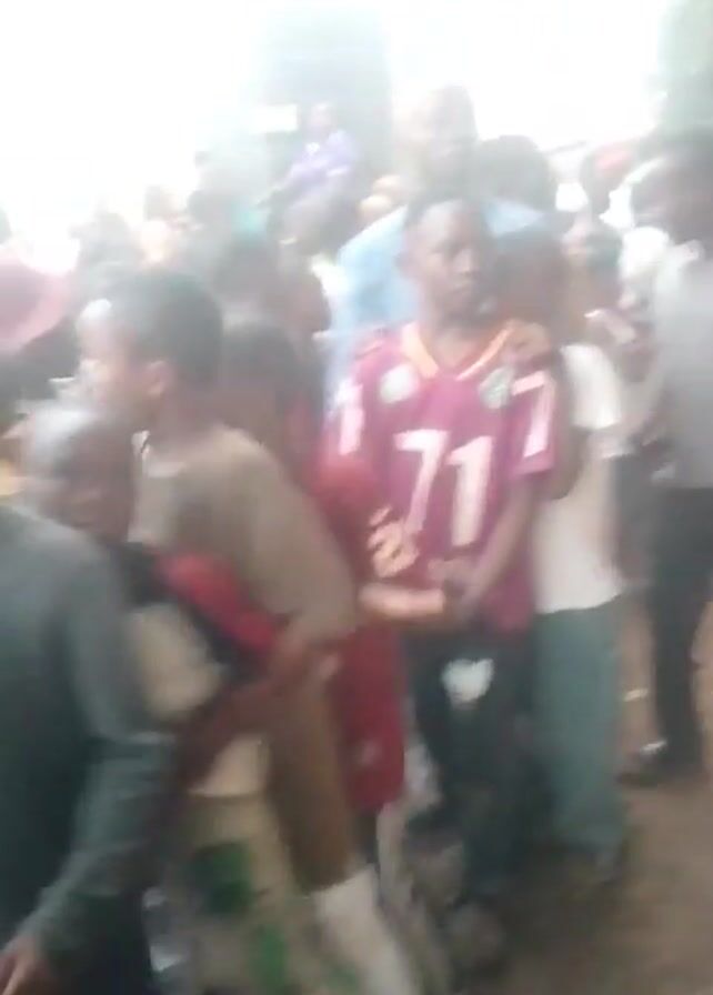 crowd of people, mostly children, standing and moving. Some are wearing casual clothes, including a jersey with the number 71 on it. One person is wearing a blue patterned shirt. The environment appears to be outdoors, possibly in a semi-rural area with trees visible in the background. The lighting is bright and hazy. There is some movement, but the overall activity is unclear.