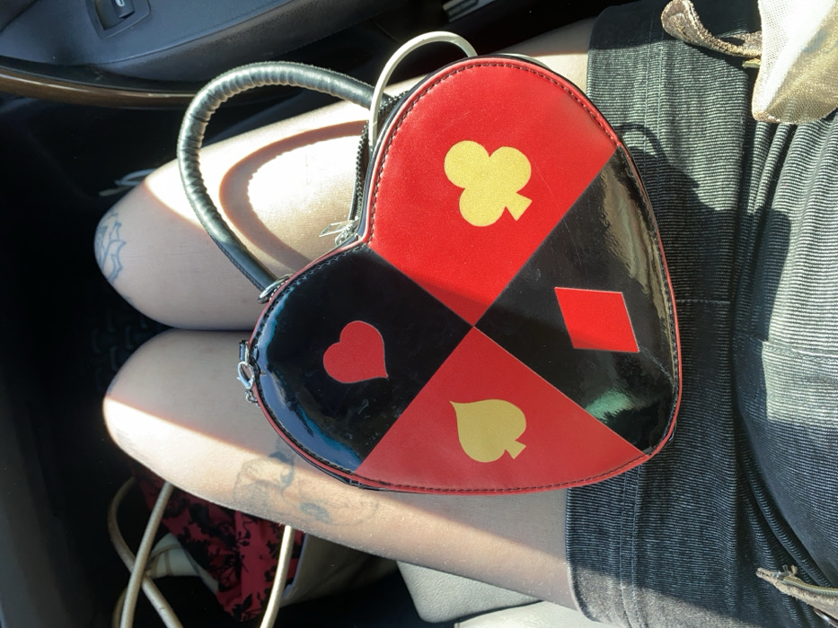 The image depicts a partial view of a person seated within a vehicle, located in Kunje, Montenegro. A heart-shaped handbag rests on the individual's lap. The handbag features a black and red checkered design, with each quadrant containing a playing card suit symbol: a red heart on black, a yellow spade on red, a yellow club on red, and a red diamond on black. It has a black handle, a zipper closure, and silver-toned metal hardware. The person's bare legs are visible, wearing dark, possibly ribbed, shorts or a skirt. Tattoos are present on both upper thighs, including a floral or mandala design on the left thigh and an indistinct marking on the right. Sunlight casts distinct shadows across the legs and handbag. In the background, to the left, a portion of another bag containing red and black patterned fabric is discernible. The interior of the vehicle, including a dark panel on the right, is visible. No specific actions or interactions are occurring beyond the placement of the handbag.