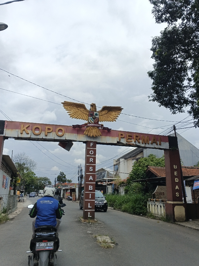 An asphalt road in Margahayu, Indonesia, passes under a large, reddish-brown and white archway. The archway is topped by a golden Garuda Pancasila emblem and displays the words "KOPO PERMAI" horizontally. Vertical text on the left pillar reads "FORSABIL," and on the right, "BEDAS." A person wearing a white helmet and a blue jacket is riding a black scooter-style motorcycle, license plate D 3088 AEQ, away from the viewer, passing beneath the archway. A dark car is partially visible on the right side of the road near the arch's right pillar, heading in the same direction. Additional vehicles are visible further down the road. Buildings, including single-story structures with various signage on the left and houses with tiled roofs partially obscured by overgrown vegetation on the right, line the street. A large tree with dark foliage stands on the right. Overhead utility wires crisscross the cloudy, overcast sky.
