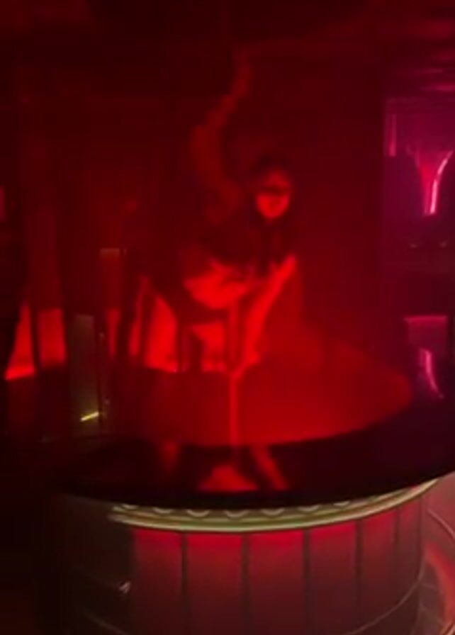 A woman performs on a pole dance platform bathed in intense red light