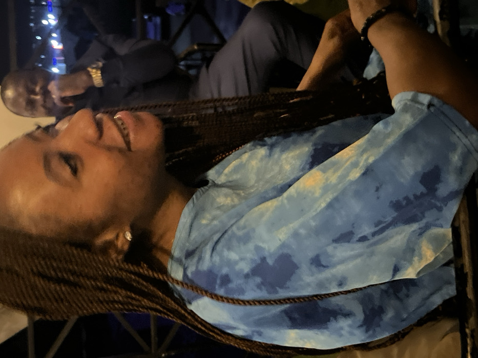 A woman with braided hair, a stud earring, and a blue and white tie-dye shirt smiles upwards. A man sits behind her, out of focus, wearing a dark suit and a gold watch. A bracelet is visible on the woman's wrist. Bright lights appear blurred in the background. The image is taken at an angle, with the subject's head tilted back.