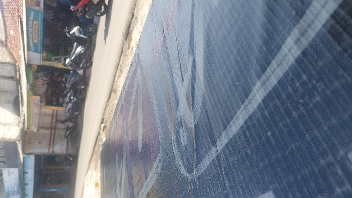 close-up of a corrugated cardboard surface, taken from a low angle. The surface is blue and textured, with light reflecting off of it, suggesting a sunny day. The cardboard has white lines running vertically and horizontally across it. The bottom of the image shows the street surface with a slight downward slope, suggesting the image was taken from a moving vehicle. The location is Sukaraja, Indonesia, as indicated by the coordinates (-6.586, 106.85). There is no information regarding people or objects in the image.